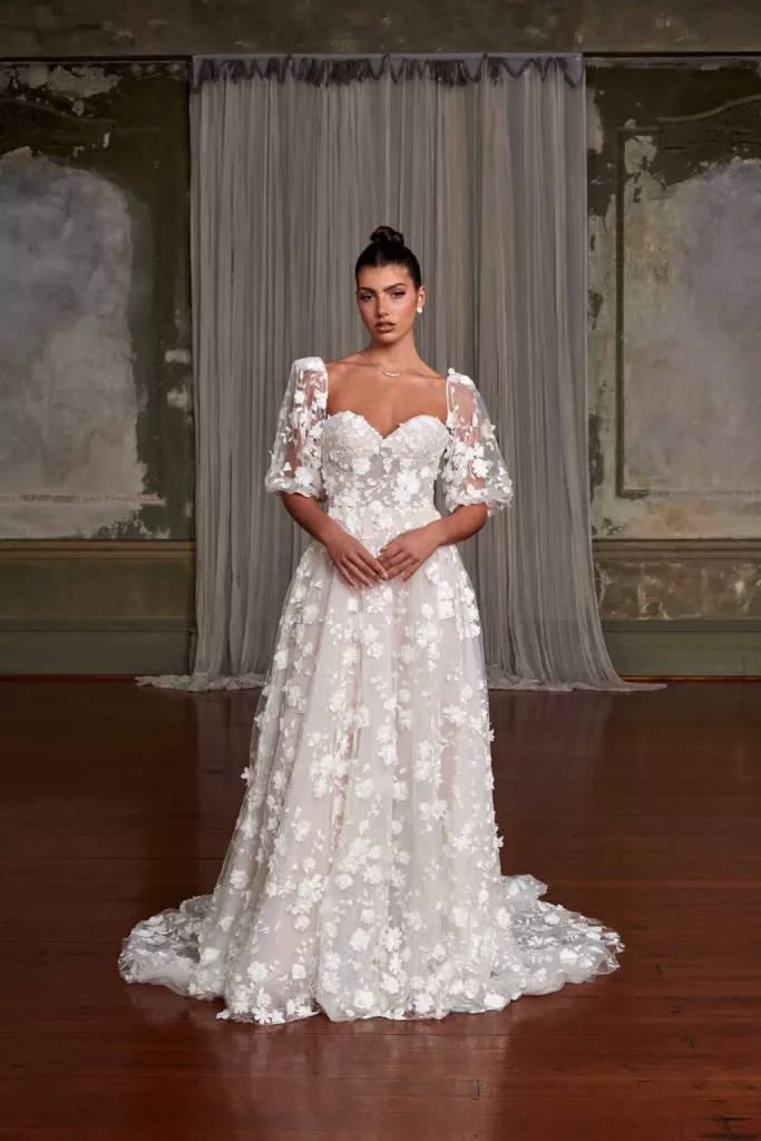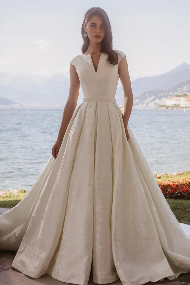 Tradition plays a significant role in many cultures and families. Choosing a modest wedding dress is a way to respect and honour the traditions passed down through generations. It’s a tribute to the values instilled by parents and grandparents, a beautiful way to connect with one’s heritage. We love this traditional gown from Abella Bride. With its high neckline with discreet V shape this dress combines romance and tradition whilst retaining modesty at its core: