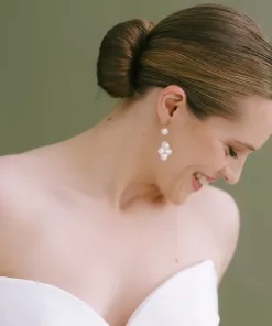 Statement modern floral pearl drop wedding earringsTallulah Clustered Flower Pearl Earrings being worn by a woman with her hair up in a neat low bun.