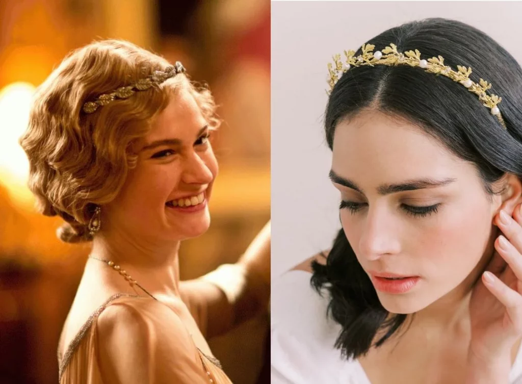 Looking for a contemporary take on the 1920’s flapper headdress, like Lady Rose? The Sweetpea headdress shown below is a crystal minimalist wedding hair wrap. You can simply pin the band in across the forehead to complete the look.