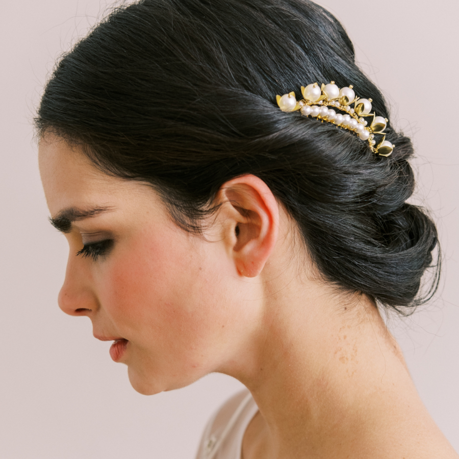 Understated, but beautifully pearly with soft burnished gold accents. With Downton Abbey vibes, the Rosalind comb below is a truly unique style hair comb, that is the perfect hair companion for a wedding with an Edwardian edge.