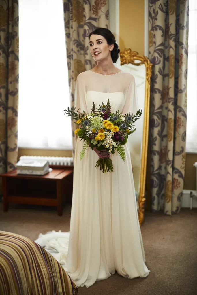 Image by David Lindsay. Sarah wore a Jenny Packham long sleeved cream dress encrusted in rice pearls and Swarovski crystals. It reflects softness and romance, similar to Lady Mary’s gown in Downton Abbey, with elegance and sophistication.