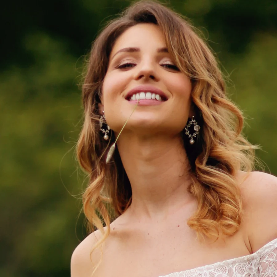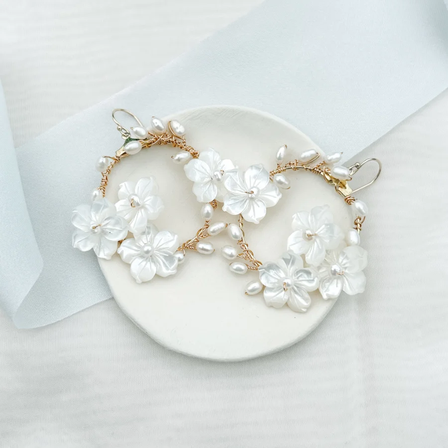 I’ve picked the Evangeline floral hoops as my first choice as they are a popular style for brides. With their lustrous mother of pearl flowers, and flawless freshwater pearls, they make the prettiest statement.