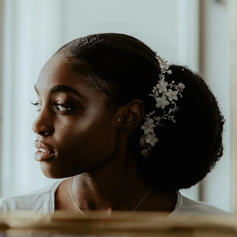 If you’re considering something with a bit more drama, then the Clematis halo is what you should choose. It is packed with winding stems of pearls and flowers and is a versatile hair vine for many hair types and styles.