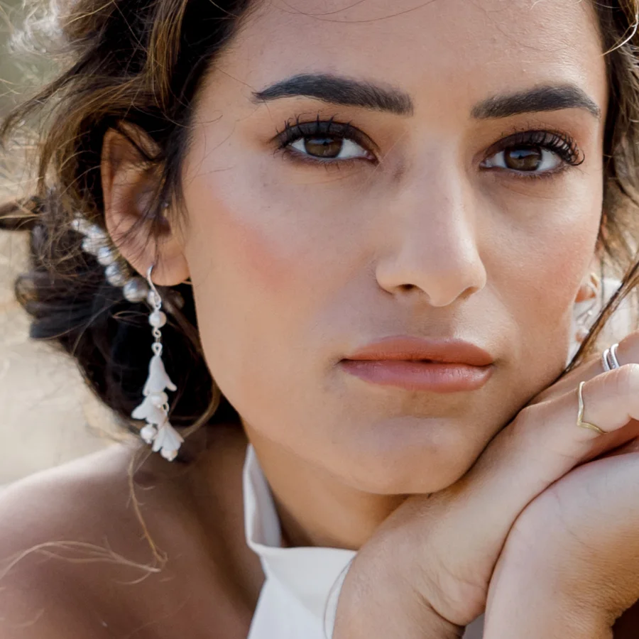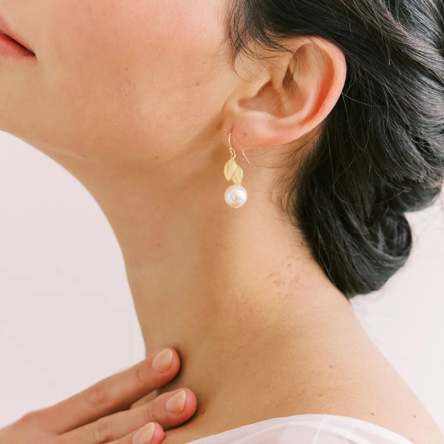 Undeniably leafy are the Azalea Earrings with their textured leaf motif with chunky ivory pearl drop. While they speak to those who love all things botanical, they also have an air of sophistication ensuring that whatever bridal gown you wear, they’ll elevate your style to perfection.