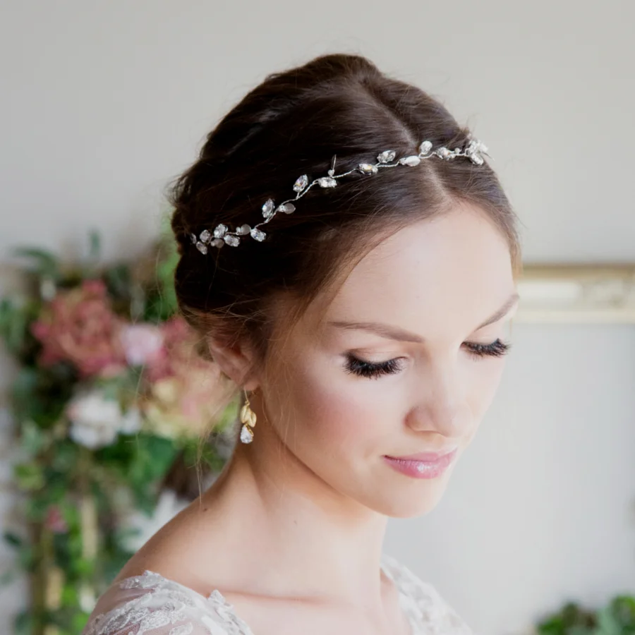 The Juniper hair vine is just that. Relaxed, weaving and unassuming. A classic example of a botanical styled hair vine that can be worn in so many ways. Wear it as a delicate headband, and attach a veil to the back to complete your look. Or twist it through a braided bridal hair style for a great reflection of nature.