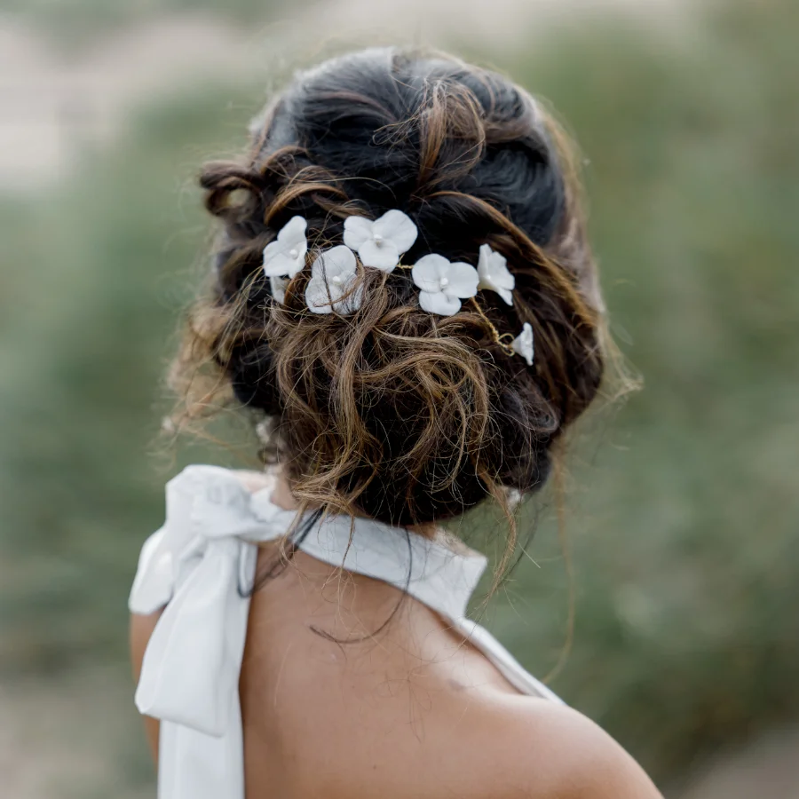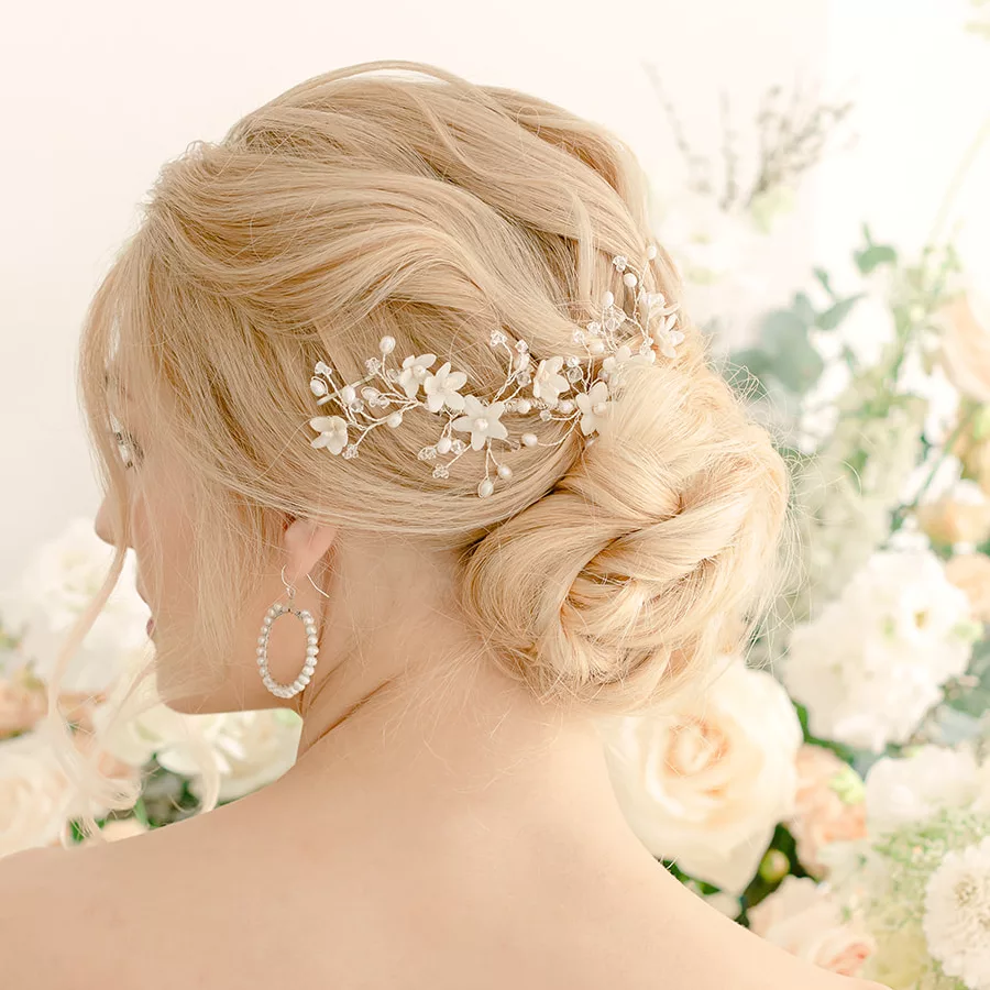 The Seraphine hair vine was designed with messy buns in mind. Easy to wear and pin in, and made to look like wild flowers. You can easily pin it over a veil to cover the comb, and it’s a style that can be worn with braids, or side detail hair styles. If you are looking for something more whimsical, then I would suggest you try Rambling Rose which is quite heavenly. Handmade flowers in various stages of opening and an informal spray of pearls makes it an easy choice for brides who love flowers.